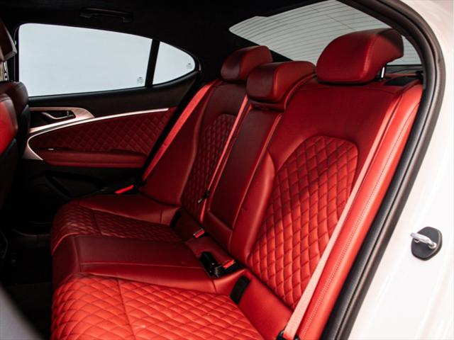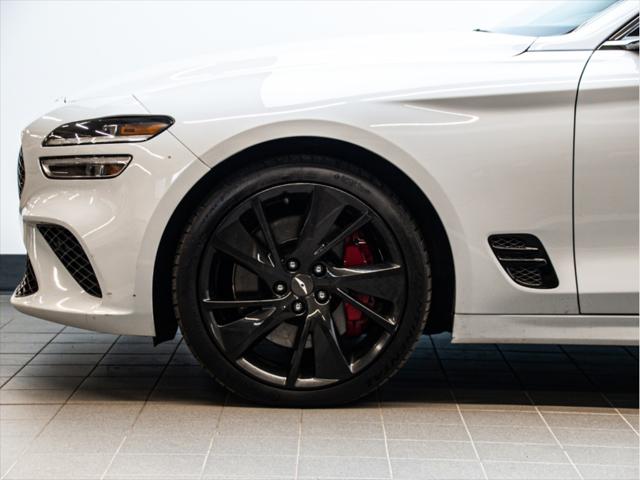 Moteur et Performance Moteur V6 biturbo de 3 3 L à essence Puissance : 365 chevaux à 6 000 tr/min Couple : 376 lb-pi à 1 300–4 500 tr/min Transmission automatique à 8 rapports avec palettes au volant Traction intégrale (AWD) Suspension à commande électronique Freins haute performance Brembo Sélecteur de modes de conduite (Éco Confort Sport Sport+) Contrôle de départ (Launch Control) Consommation (estimée) Ville : 13 3 L/100 km Route : 9 7 L/100 km Combinée : 11 7 L/100 km Type de carburant : Super (essence premium) Éléments extérieurs Roues en alliage de 19 po (design sport) Phares et feux arrière quadruples à DEL Calandre sport avec fini chrome foncé Toit ouvrant électrique Coffre intelligent mains libres Rétroviseurs extérieurs chauffants et repliables électriquement Intérieur et confort Sellerie en cuir Nappa Siège du conducteur à 16 réglages électriques Siège du passager à 12 réglages électriques Sièges avant chauffants et ventilés Sièges arrière chauffants Volant chauffant Garnitures intérieures en aluminium Climatisation automatique à deux zones Éclairage dambiance intérieur Infodivertissement et connectivité Écran tactile de 10 25 po Navigation avec circulation en temps réel Apple CarPlayMC et Android AutoMC Système audio haut de gamme Lexicon à 15 haut-parleurs Chargeur sans fil pour téléphone intelligent Tableau de bord numérique 3D de 12 3 po Sécurité et aide à la conduite Assistance à la conduite sur autoroute Assistance à lévitement de collision dans les angles morts Assistance à la prévention de collision frontale (piéton cycliste intersection) Assistance à lévitement de collision transversale arrière Caméra à vue panoramique (360°) Régulateur de vitesse intelligent avec arrêt/démarrage Assistance au maintien et au suivi de voie Avertisseur de distance de stationnement (avant et arrière) Dimensions Longueur : 4 685 mm Largeur : 1 850 mm Hauteur : 1 400 mm Empattement : 2 835 mm Volume du coffre : 297 L