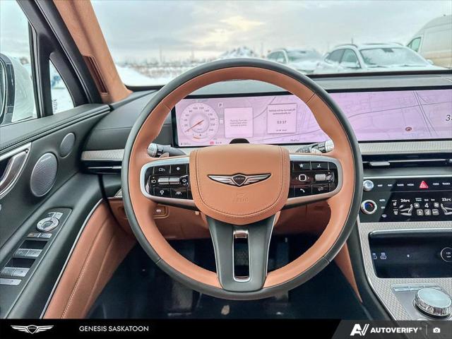 Our GV80's trim level is 3.5T Prestige AWD 7P. The interior delivers exceptional luxury and versatility with leather seating surfaces across three rows including power-folding third-row seats and 12-way adjustable heated and ventilated front seats with lumbar support and a smart posture care system. A heated leather steering wheel genuine wood trim and ambient lighting create a refined atmosphere while the integrated 27-inch OLED display provides seamless access to navigation connected services and entertainment through a Bang & Olufsen 18-speaker audio system. Every passenger enjoys tailored comfort with multi-zone climate control rear sunblinds and ample space enhanced by meticulous craftsmanship. Advanced safety technologies like Highway Driving Assist II Blind-Spot Collision-Avoidance and an Aerial View Camera System combine with automatic remote parking and collision mitigation features to ensure confidence on every journey.