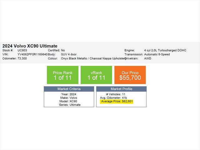 TOP FEATURES INCLUDE - Heads-up display Premium Sound by Bowers and Wilkins Nappa Soft Leather Perforated and Ventilated Upholstery & MORE!! Volvo being known for being one of the most reliable and one of the highest safety rating in the market makes it easier for anyone to get into one! Reliability making you think less about any future upkeep on the vehicle and high safety ratings benefitting you for possible lower insurance spending. Our XC90 has a clean Carfax with no accidents/claims gives you added bonus! Experience luxury without compromise in this stunning 2024 Volvo XC90 Ultimate the pinnacle of Scandinavian design safety and performance. Finished with a refined interior featuring premium Nappa leather real wood trim panoramic sunroof Bowers & Wilkins sound system and Volvos full suite of advanced driver assistance technologies this SUV delivers a first-class driving experience for both driver and passengers. With powerful yet smooth performance cutting-edge infotainment and legendary Volvo safety the XC90 Ultimate is the perfect blend of elegance innovation and confidence on the road. Main key features on this XC90 Ultimate: Performance Features: - In-Line 4cyl supercharge and turbocharged - 295 horsepower and 310 lb-ft of torque - All wheel drivetrain Exterior Features: - Active Bending Headlights with Adaptive Shadow Technology - Front LED Foglights with Cornering Function - Headlight Cleaning System - Automatic LED Headlights with Active High Beam incorporating - Colour Coordinated Autofolding Heated Power Door Mirrors Day Running Lights - Adaptive Brake Lights including High Level LED Brake Light - Rain Sensor - Automatic Windscreen Wiper Activation - Handsfree Tailgate Opening/Closing - Front and Rear Park Assist Interior Features: - Power Glass Tilt and Slide Panoramic Sunroof with Sun Curtain - Parking Camera 360 Surround View with Side Proximity Sensors - Integrated Sun Curtains - Rear Doors - Head-Up Display in Windscreen - Premium Sound by Bowers and Wilkins - Power Glass Tilt and Slide Panoramic Sunroof with Sun Curtain - Ambient Door and Instrument Panel Lighting - Fresh Air Subwoofer In Addition this Vehicle was: - Fully Inspected & Approved by our Certified Hyundai/Genesis Technicians - Extensive mechanical & appearance reconditioning process - Full Tank of Gas COMPETITIVE FINANCE RATES ARE AVAILABLE. WE PAY TOP DOLLAR FOR TRADE-INS Contact us now to book a test drive. One of our friendly and knowledgeable representatives will be happy to help! From out of town? Book a Live Video Call Appointment and we will show you the vehicle from all angles while answering your questions in real-time. *Come to see How Maple Hyundai is changing the Way GTA buys Cars*