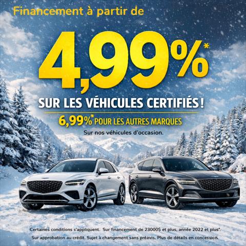 *Buying a Genesis brand vehicle means benefiting from exceptional value! Flexible financing offers Simple and easy credit process. A Complete mechanical Inspection in 191 Points! Contact one of our specialists for more informations on our Genesis Certified program.