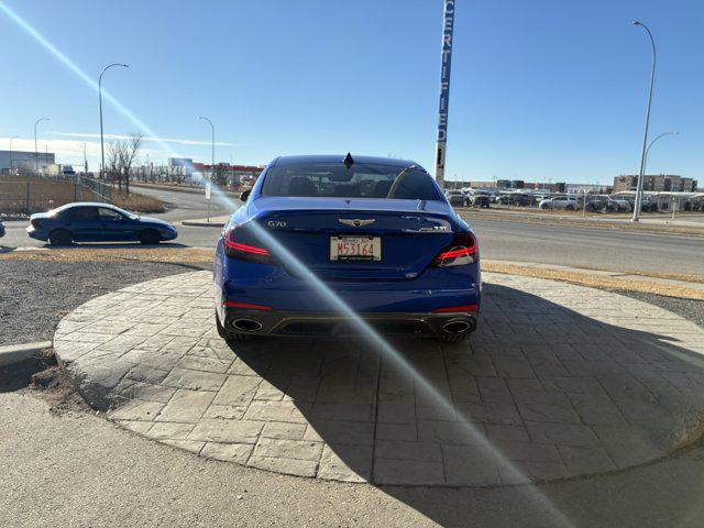 Only 32 655 Miles! This Genesis G70 delivers a Twin Turbo Premium Unleaded V-6 3.3 L/204 engine powering this Automatic transmission. MALLORCA BLUE BLACK/SPORT RED NAPPA LEATHER SEAT TRIM Wireless Phone Connectivity.*This Genesis G70 Comes Equipped with These Options *Window Grid Antenna Wheels: 19 x 8J Fr & 19 x 8.5J Rr Aluminum Alloy -inc: Black 5-spoke Wheels w/Black Accents Valet Function Trip Computer Transmission: 8-Speed Automatic w/SHIFTRONIC -inc: paddle shifters and selectable drive mode (Smart Eco Comfort Sport Custom) Transmission w/Driver Selectable Mode and Oil Cooler Tracker System Tires: P225/40R19 Front & P255/35R19 Rear Summer -inc: High-performance summer Tire Specific Low Tire Pressure Warning.****Payments O.A.C.*The advertised price does not include GST. Discounts may include available manufacturer discounts and/or incentives. Discounts and/or incentives from both the dealership and manufacturer may have certain criteria for eligibility and must be qualified for depending on the nature of the discount and model of vehicle involved. Discounts offered by the manufacturer have discrete legal regulations available on the corresponding manufacturer site. See dealer for all current discount eligibility details. Vehicle data is subject to change without notice. AMVIC Licensed Dealer.