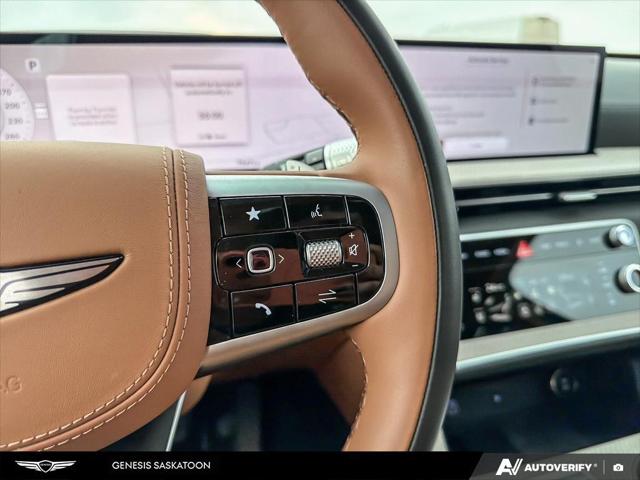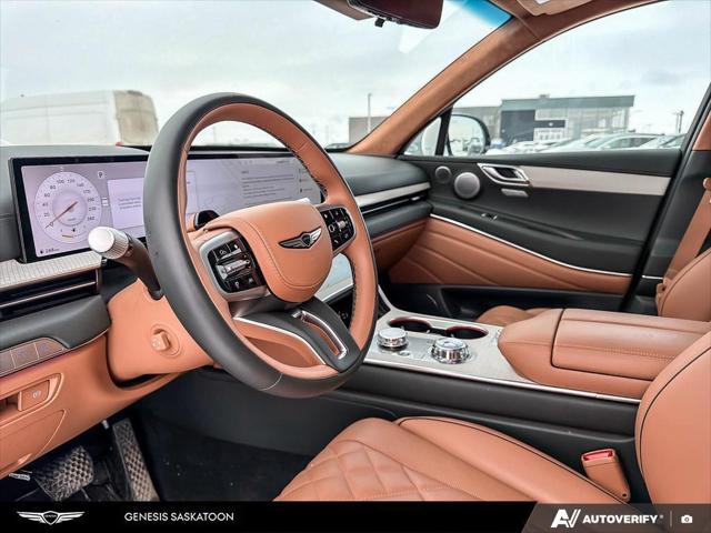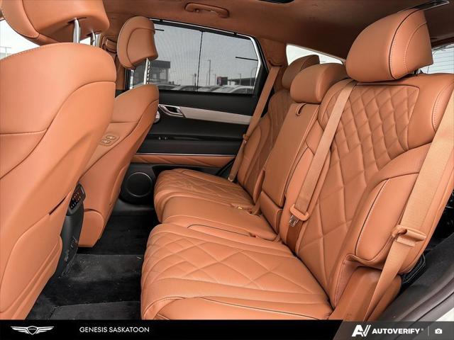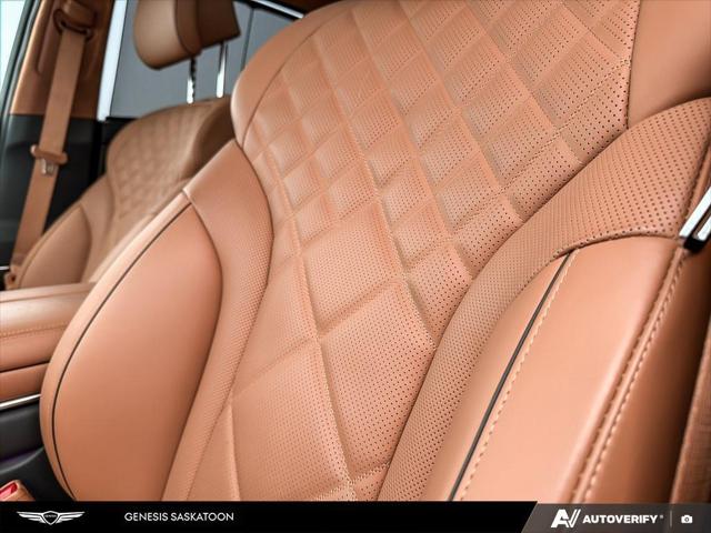 Our GV80's trim level is 3.5T Prestige AWD 7P. The interior delivers exceptional luxury and versatility with leather seating surfaces across three rows including power-folding third-row seats and 12-way adjustable heated and ventilated front seats with lumbar support and a smart posture care system. A heated leather steering wheel genuine wood trim and ambient lighting create a refined atmosphere while the integrated 27-inch OLED display provides seamless access to navigation connected services and entertainment through a Bang & Olufsen 18-speaker audio system. Every passenger enjoys tailored comfort with multi-zone climate control rear sunblinds and ample space enhanced by meticulous craftsmanship. Advanced safety technologies like Highway Driving Assist II Blind-Spot Collision-Avoidance and an Aerial View Camera System combine with automatic remote parking and collision mitigation features to ensure confidence on every journey.
