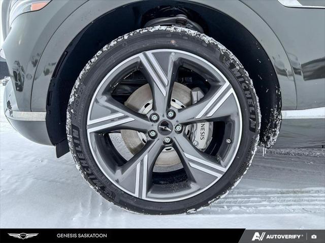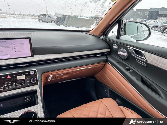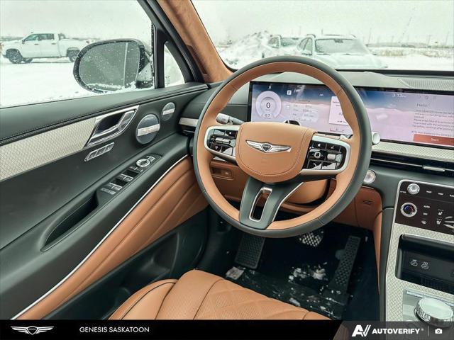 Our GV80's trim level is 3.5T Prestige AWD 7P. The interior delivers exceptional luxury and versatility with leather seating surfaces across three rows including power-folding third-row seats and 12-way adjustable heated and ventilated front seats with lumbar support and a smart posture care system. A heated leather steering wheel genuine wood trim and ambient lighting create a refined atmosphere while the integrated 27-inch OLED display provides seamless access to navigation connected services and entertainment through a Bang & Olufsen 18-speaker audio system. Every passenger enjoys tailored comfort with multi-zone climate control rear sunblinds and ample space enhanced by meticulous craftsmanship. Advanced safety technologies like Highway Driving Assist II Blind-Spot Collision-Avoidance and an Aerial View Camera System combine with automatic remote parking and collision mitigation features to ensure confidence on every journey.